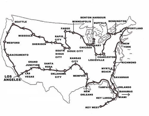 America Route The Route around America − starting and finishing point Los Angeles. The route around America took a fair amount of planning, especially as I intended visiting all 48 states, (Hawaii and Alaska being excluded for obvious reasons). With the distance between the west coast and the east coast being approximately 3,000 miles (and likewise east to west of course) and north to south being around 2,000 miles, as the crow flies (and again vice-versa), a conservative estimate of 10,000 miles in total would normally be appropriate for a straight-forward circumnavigation of the continent, but once all of my detours had been taken into account, either for sight-seeing, or when visiting out of the way states, then that original figure was soon propelled to over 12,000! The first crossing, from Los Angeles, California, to Miami, Florida, which carried me through fifteen states and took fifteen days to complete, saw the first 4,000 miles disappear into oblivion and even though I spent the next fourteen days officially on vacation with my children, we still managed to notch-up around 900 miles travelling in and around the ‘sunshine state’. The journey up the east coast to Maine saw me travelling through more states in one day than I had done in a week, simply because of their close proximity to each other, but in stark contrast to this, the journey back across to the west coast seemed never-ending, as each state I crossed into appeared to be larger than the last! |